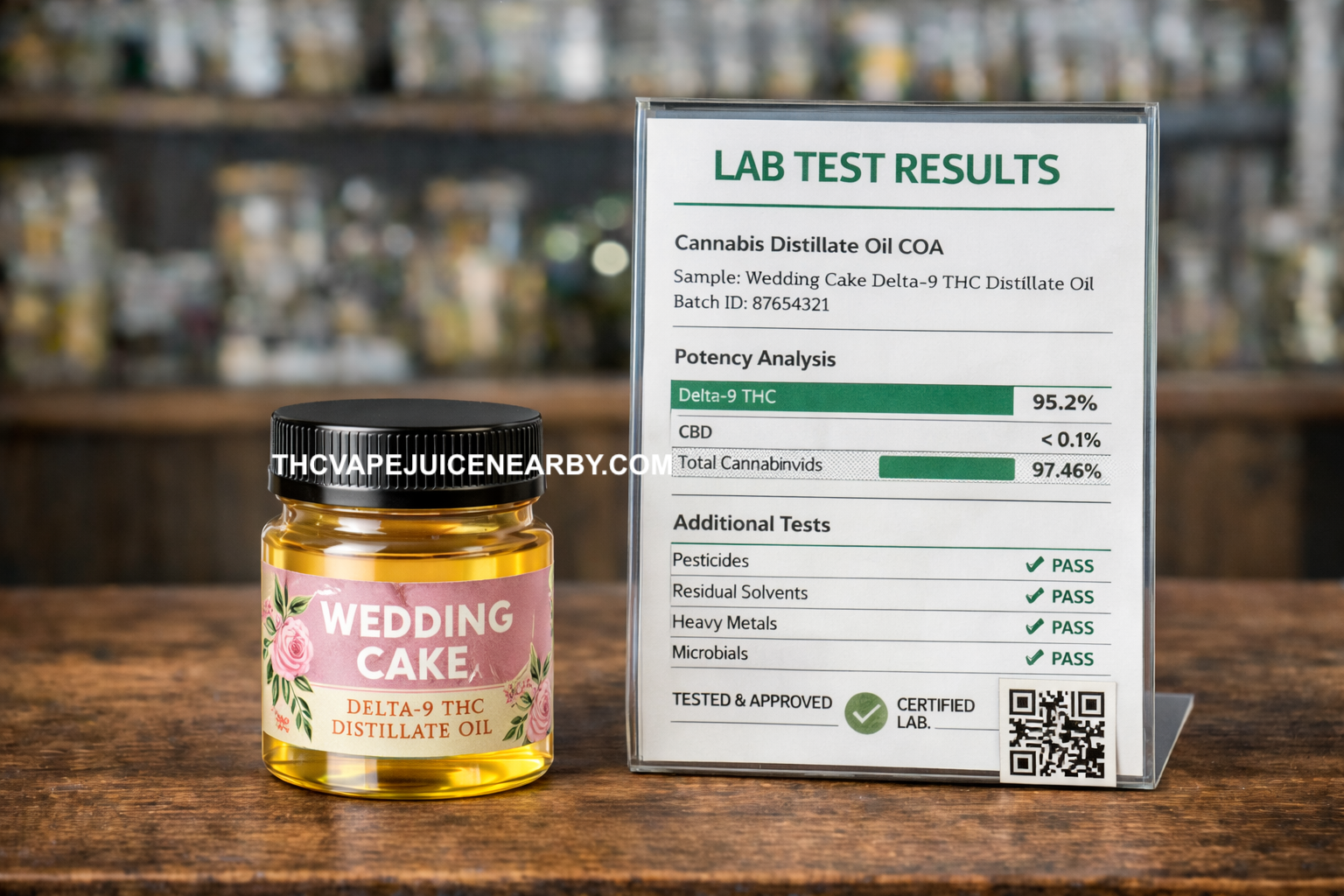 Every batch of Wedding Cake Delta-9 THC Distillate Oil is supported by a Certificate of Analysis (COA) from a certified analytical laboratory. Standard testing panels typically include: