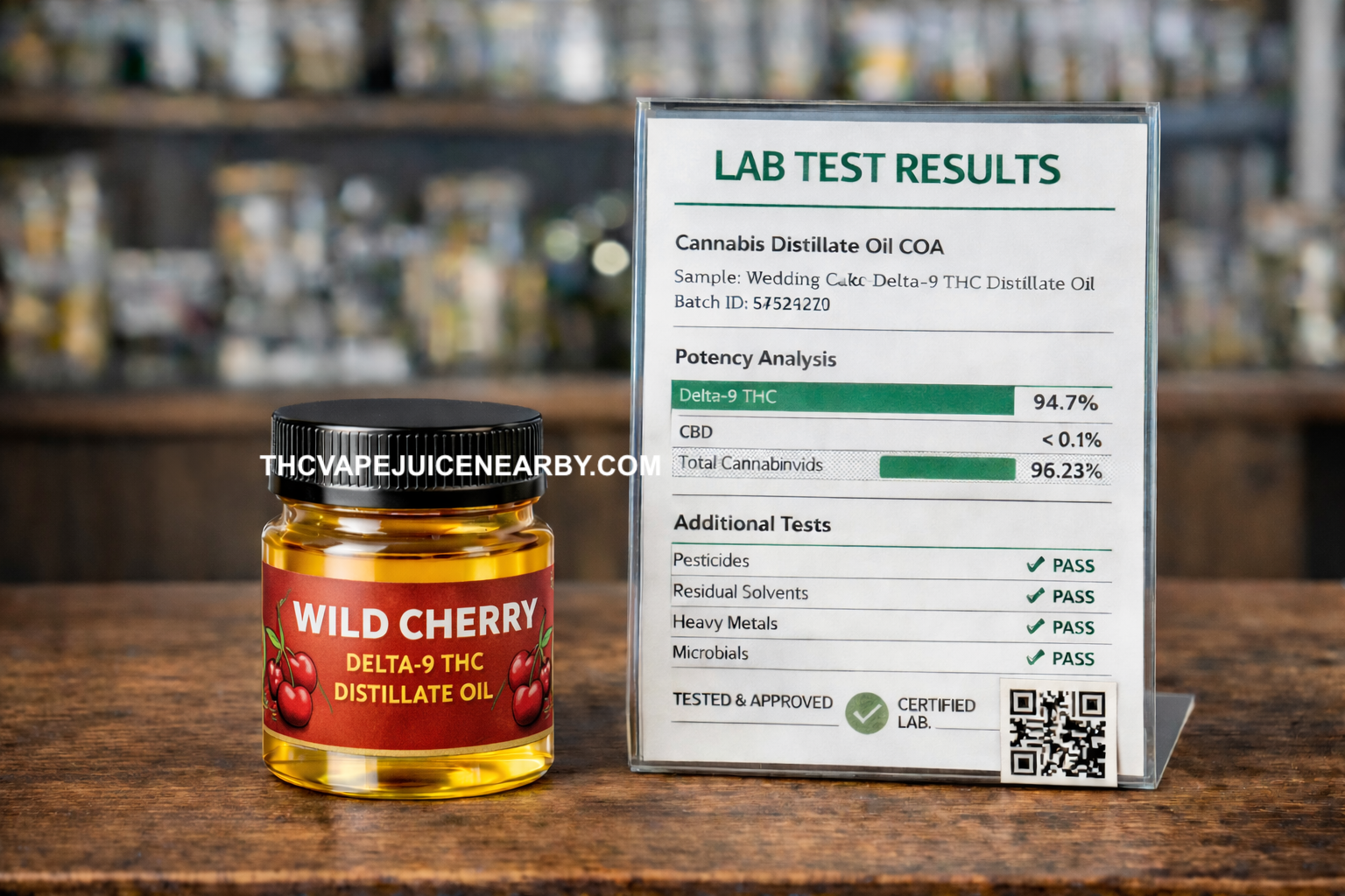 Every liter of Wild Cherry Delta-9 THC Distillate Oil is accompanied by a Certificate of Analysis (COA) from a certified third-party laboratory. Lab testing typically includes: